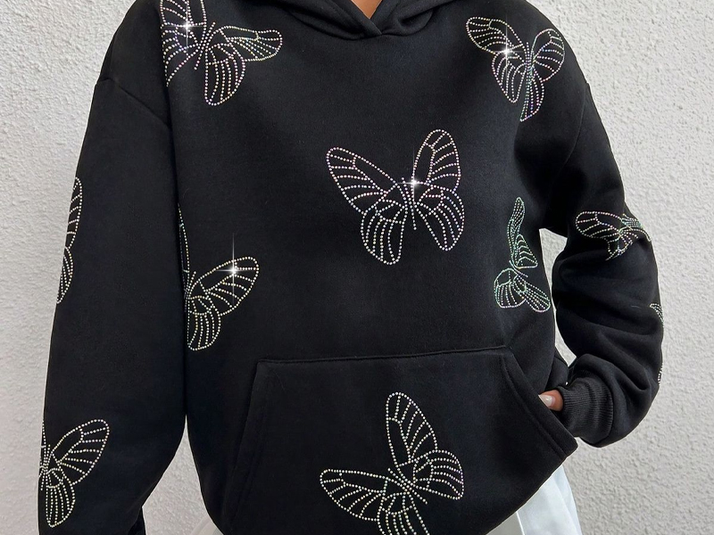 زينة بأحجار الراين: كل هودي مُزين بأحجار الراين المُرتبة بعناية، مما يُضفي لمسةً من التألق على تصميمه العصري. تلتقط الزينة الضوء من كل زاوية، مُضفيةً بريقًا رقيقًا ينتقل بسلاسة من النهار إلى الليل.